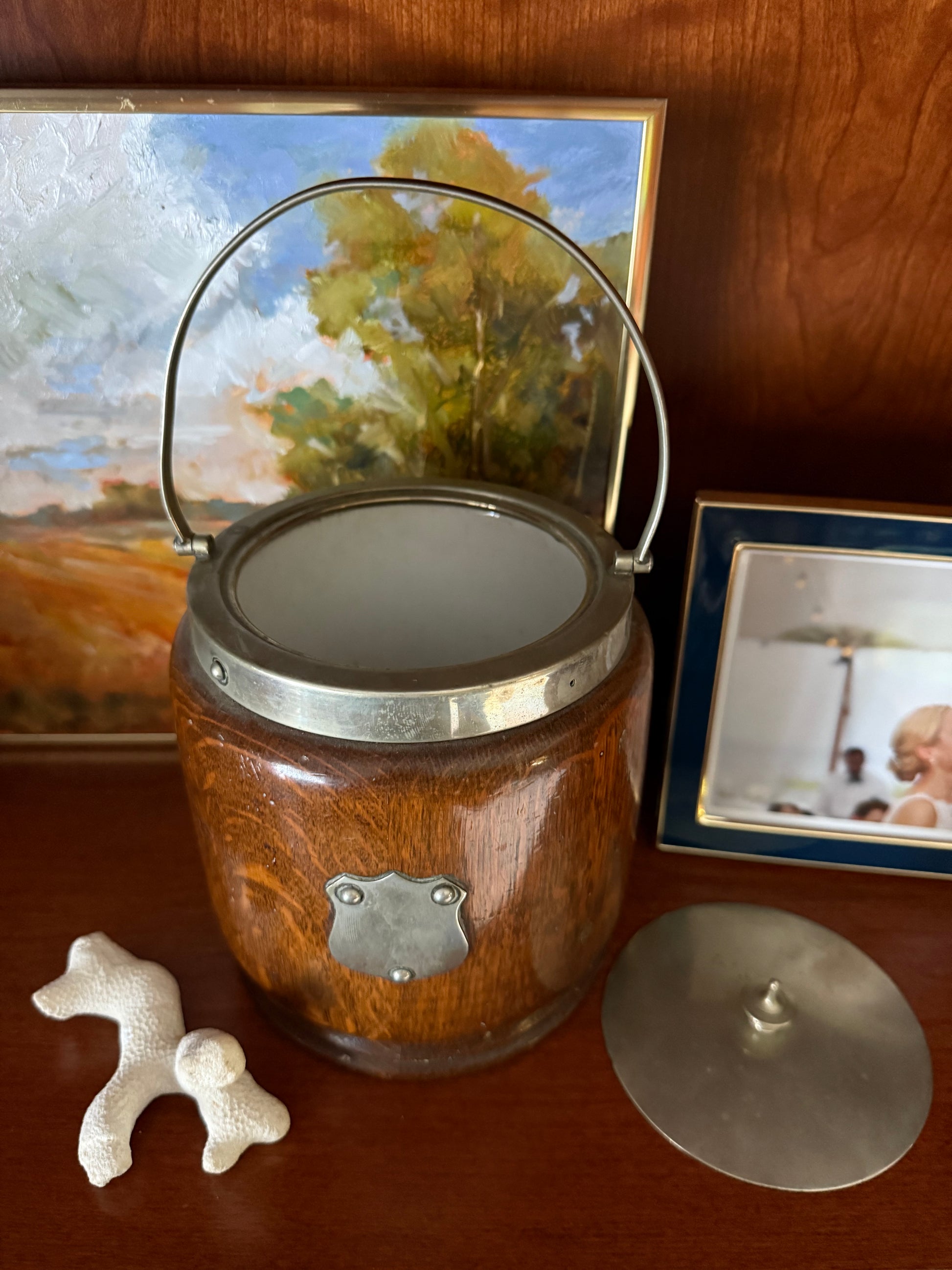 Antique English Oak and Silverplate Biscuit Barrel