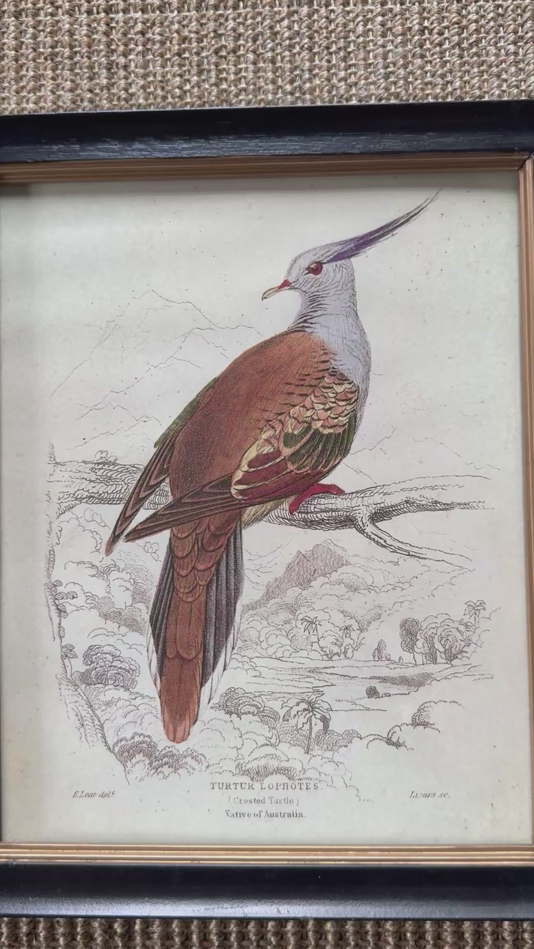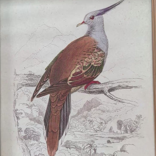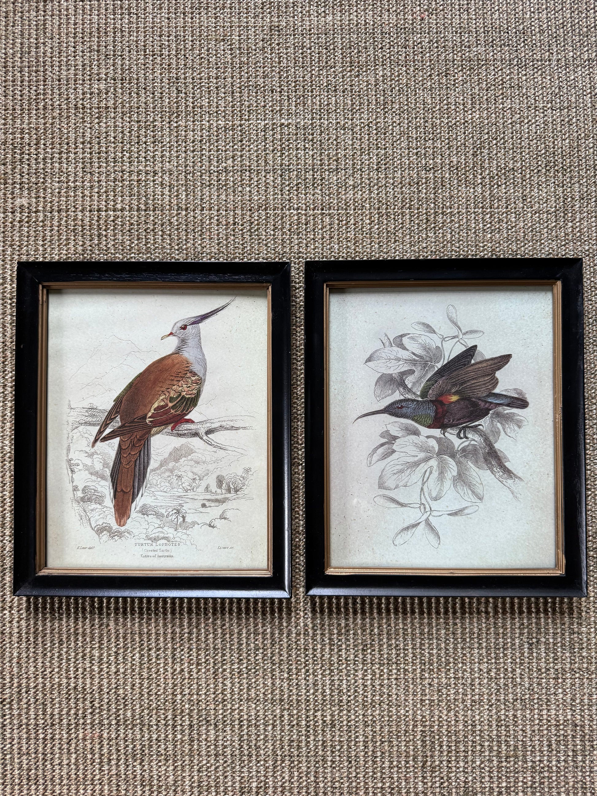 “Tutor Lophotes” and “Hummingbird.” Black painted frame with gold band. Each measures appx 11 1/4” x 9 1/4”.